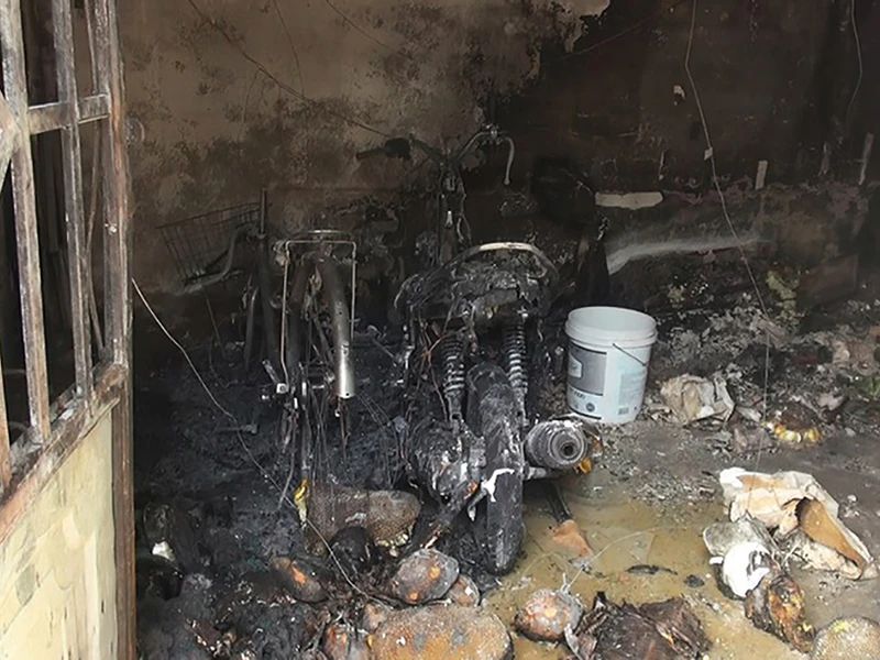 Bên trong phòng trọ, xe máy, xe đạp và nhiều đồ đạc bị cháy rụi. Ảnh: NT