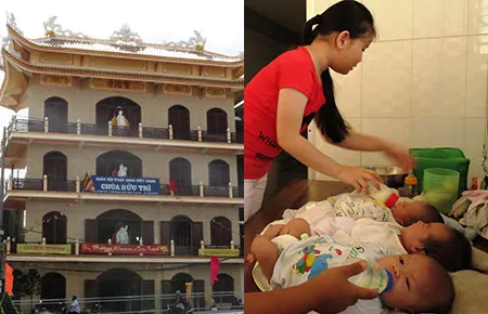 Chùa Bửu Trì - nơi xảy ra vụ bắt cóc cháu Duy (ảnh trái). Chăm sóc trẻ mồ côi ở chùa Bửu Trì. Ảnh: GIA TUỆ