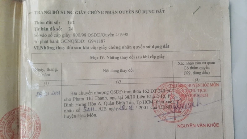 Quá trình điều tra, công an xác định được một người phụ nữ sử dụng tên Phạm Thị Thanh (sinh năm 1968, HKTT: phường Bình Hưng Hòa A, quận Bình Tân, TP.HCM) đến TP Bà Rịa, tỉnh Bà Rịa-Vũng Tàu làm ăn. Qua quen biết, cần tiền nên người này đã dùng một giấy chứng nhận quyền sử dụng đất mang tên NTC tại huyện Hóc Môn, TP.HCM để công chứng, ủy quyền định đoạt thửa đất trên cho bà Minh (43 tuổi, ngụ TP Bà Rịa) nhận lấy số tiền 1,2 tỉ đồng. Trên giấy chứng nhận, ở phần trang bổ sung ghi rõ đất này đã được chuyển nhượng cho Thanh từ năm 2001.