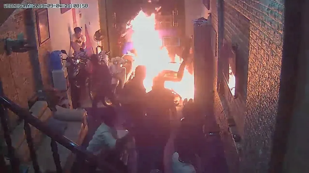 "Có 1 người thanh niên cầm can xăng bên tay trái, tay phải cầm hột quẹt. Hơi xăng bốc qua gây cháy, rồi người này quăng xuống đất. Nó cháy lan tới mấy chiếc xe, tôi chạy lên lầu liền, vì còn vợ tôi trên đó.