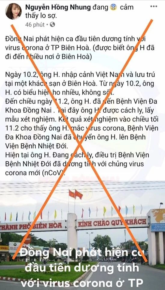 Chiều 12-2, trên mạng xã hội Facebook cá nhân “Nguyễn Hồng Nhung” xuất hiện nội dung: “Đồng Nai phát hiện ca đầu tiên dương tính với virus Corona" sai sự thật, gây lo lắng trong dân.