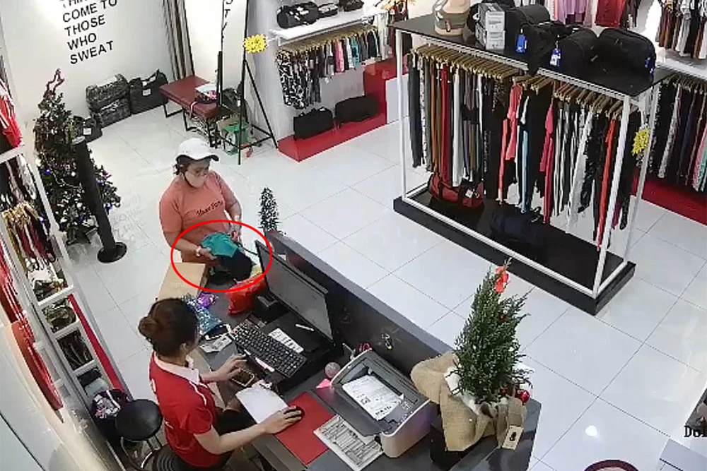 Người phụ nữ dùng áo gói chiếc điện thoại trộm để qua mặt nhân viên cửa hàng ở số 70 Trịnh Đình Trọng, phường Phú Trung, quận Tân Phú ngày 16-12. Ảnh: NGUYỄN YÊN