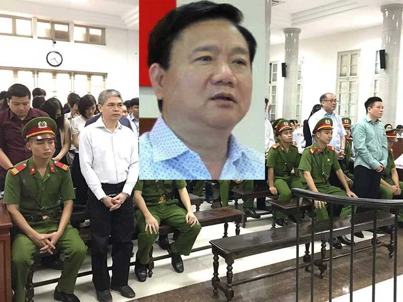 Ông Đinh La Thăng (ảnh nhỏ). Bị cáo Nguyễn Xuân Sơn (bìa trái) và bị cáo Hà Văn Thắm (bìa phải) tại phiên tòa xử vụ OceanBank. Ảnh: INTERNET