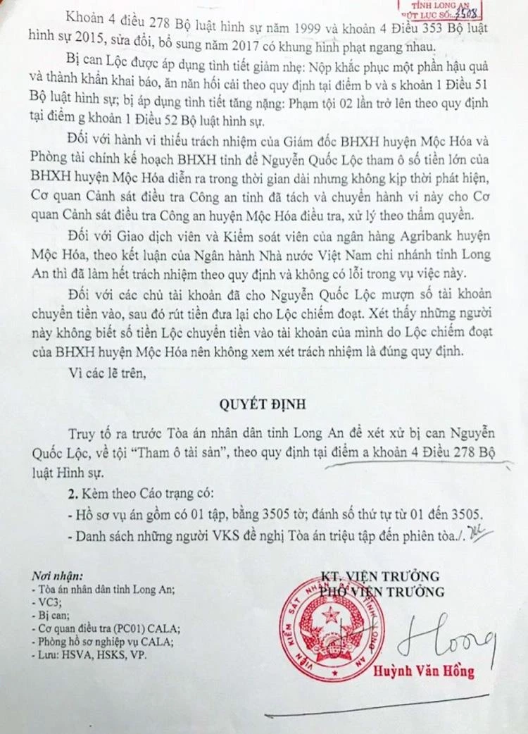 VKSND tỉnh Long An đã ban hành cáo trạng, truy tố bị can Nguyễn Quốc Lộc (SN 1978) cựu kế toán trưởng bảo hiểm xã hội (BHXH) huyện Mộc Hóa, tỉnh Long An về tội danh tham ô tài sản theo điểm a, khoản 4, Điều 278 BLHS.