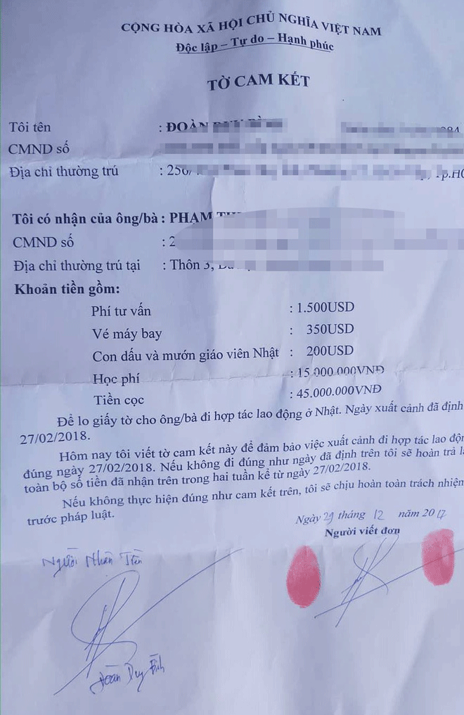 Việc nhận tiền cọc của 104 người đi xuất khẩu lao động được hợp thức hóa bằng hợp đồng nguyên tắc để ký hợp đồng vay tiền có công chứng.