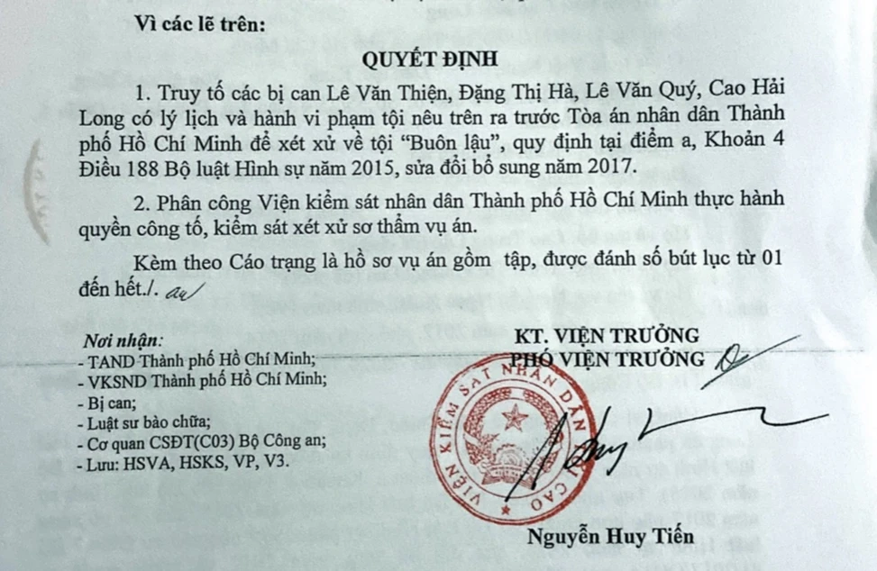 VKSND Tối cao vừa hoàn tất cáo trạng truy tố Lê Văn Thiện (sinh năm 1987, tại Thanh Hoá, kinh doanh tự do) cùng ba đồng phạm ra trước TAND TP.HCM để xét xử về tội buôn lậu.