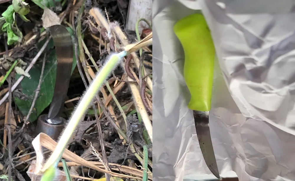 Lực lượng công an thu giữ hung khí mà hung thủ vứt ở bãi đất trống. Ảnh: LÊ ÁNH
