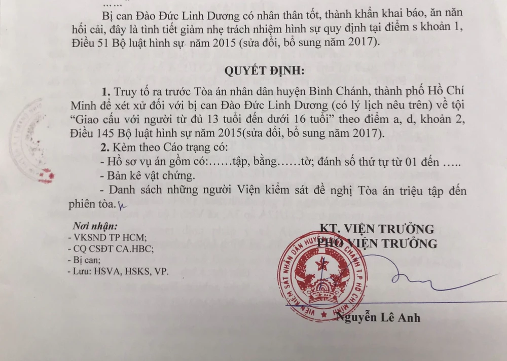 VKSND huyện Bình Chánh, TP.HCM đã hoàn tất cáo trạng truy tố đối với bị can Đào Đức Linh Dương (SN 1999) về tội giao cấu với người từ đủ 13 đến dưới 16 tuổi. Bị hại là PTTL (sinh ngày 14-5-2004).