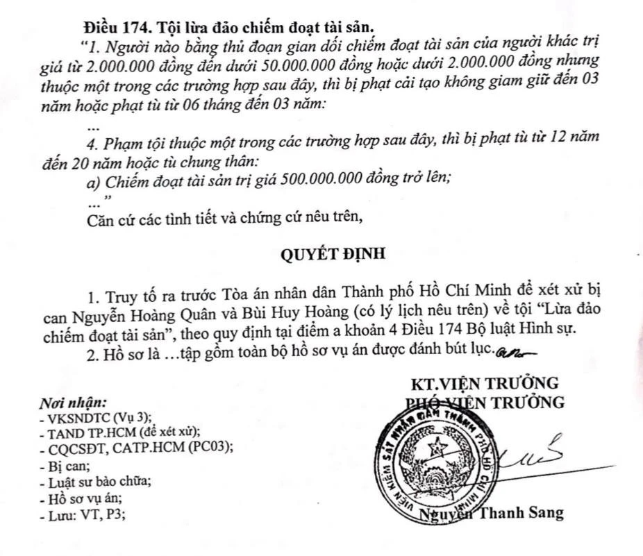 VKSND TP.HCM vừa hoàn tất cáo trạng và chuyển hồ sơ truy tố Nguyễn Hoàng Quân (tổng giám đốc Công ty Cổ phần Forex Toàn Cầu), Bùi Huy Hoàng (giám đốc tài chính của công ty) ra toà cùng cấp về tội lừa đảo chiếm đoạt tài sản theo khoản 4, Điều 174, BLHS.