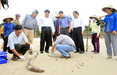 UBND tỉnh Quảng Trị kiểm tra tình trạng cá chết dọc biển. Ảnh: VGP