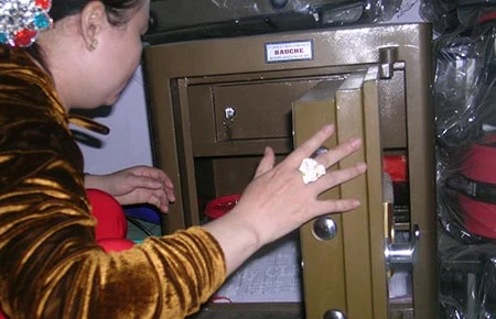 Chị Phạm Thị Ngọc Tuyết bên cạnh chiếc két sắt bị trộm. Ảnh: NG.TÝ