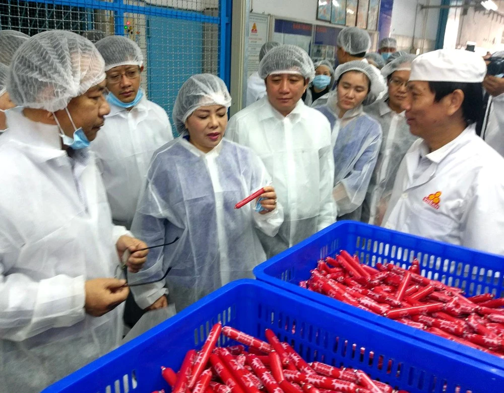 Bộ trưởng Bộ Y tế Nguyễn Thị Kim Tiến tham quan dây chuyền sản xuất xúc xích của VISSAN. Ảnh: TRẦN NGỌC