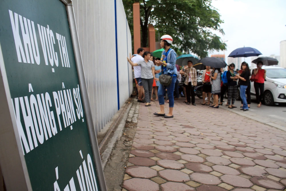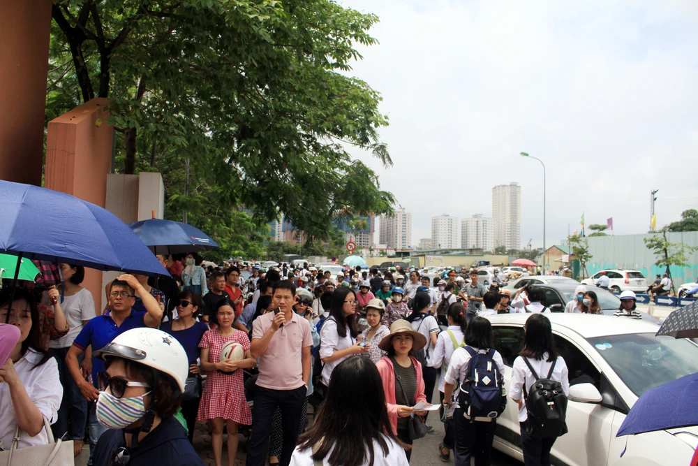 Cổng trường THPT chuyên Hà Nội - Amsterdam rất đông phụ huynh đứng trước cổng trường chờ con bước ra khỏi phòng thi.