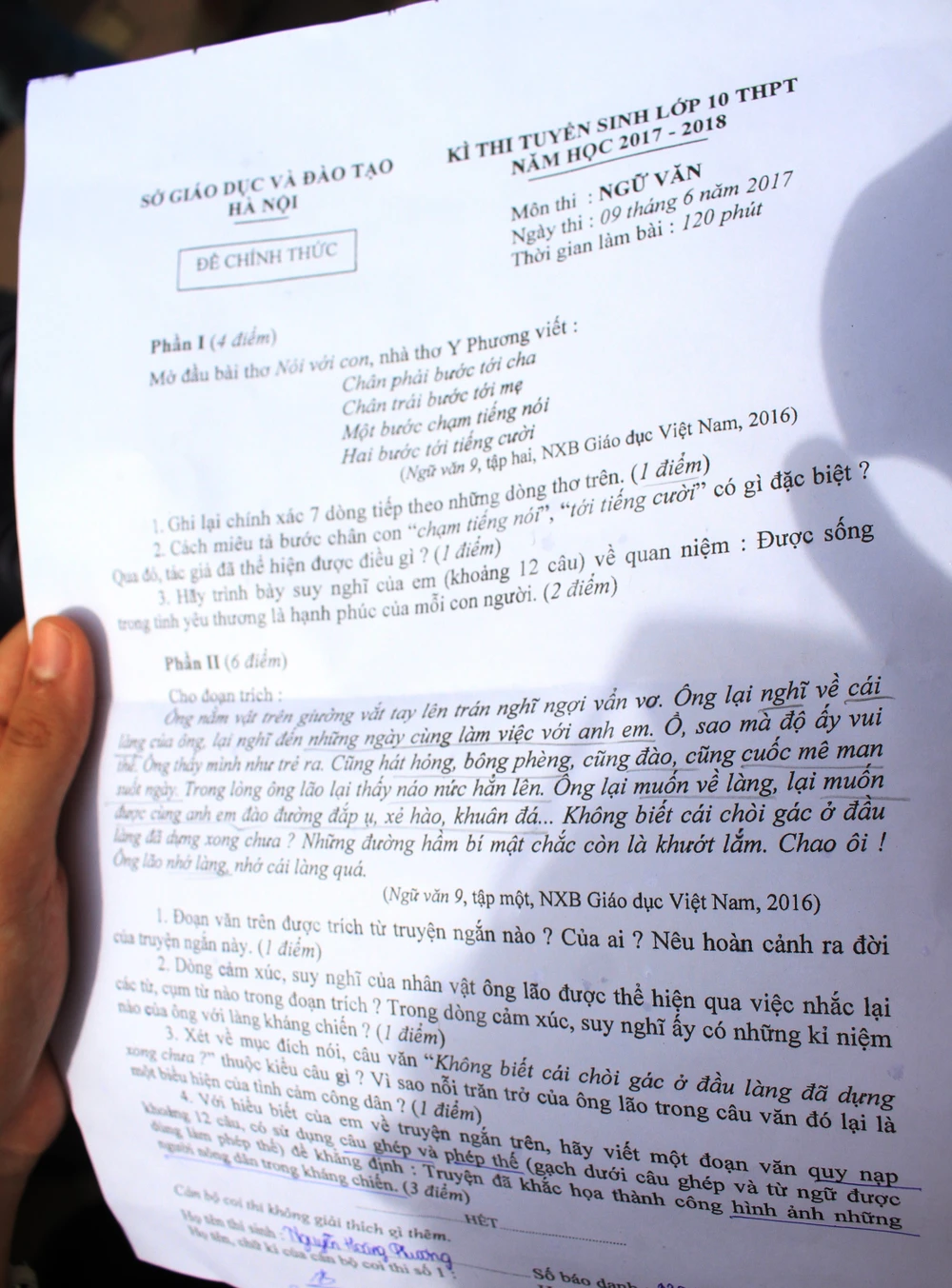 Đề thi chính thức môn ngữ văn của kỳ thi vào lớp 10 của Hà Nội