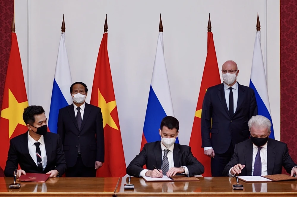 Đại diện Tập đoàn T&T, Quỹ Đầu tư trực tiếp Liên bang Nga và Tập đoàn Binnopharm trao biên bản ghi nhớ hợp tác về việc chuyển giao công nghệ sản xuất "chu trình đầy đủ" vaccine Sputnik V.