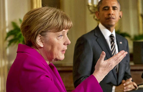 Thủ tướng Đức Angela Merkel và Tổng thống Obama tại cuộc họp báo chung ngày 9-2. Ảnh: AP