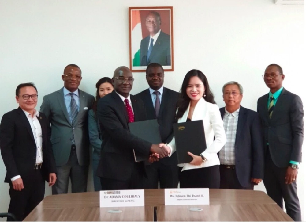 Tổng Giám đốc Hội đồng Bông và Điều Bờ Biển Ngà Coulibaly và Phó Tổng Giám đốc Tập đoàn T&T Group Nguyễn Thị Thanh Bình ký kết thỏa thuận hợp tác chiến lược.