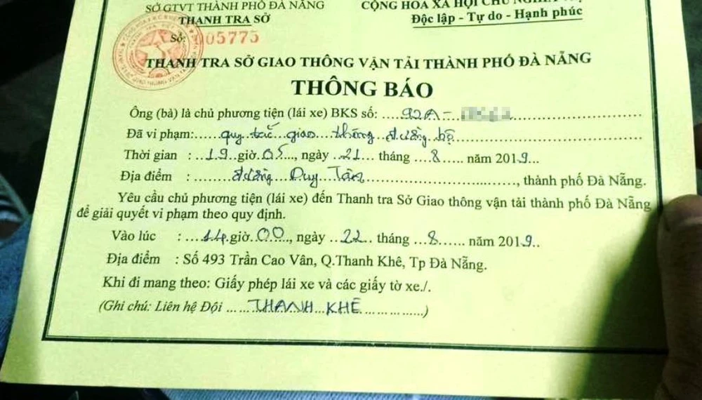 Thông báo của TTGT dán lên xe trước khi rời đi.