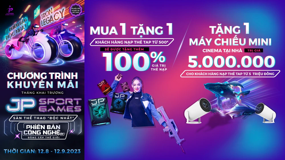 Diện mạo hoàn toàn mới của JP Sport Games sẽ mang đến trải nghiệm mãn nhãn cho tín đồ đam mê giải trí công nghệ. Đặc biệt, nhân dịp ra mắt JP Sport Games, trong khung giờ vàng từ 13 giờ -16 giờ ngày 12 đến 14-8 khách hàng được miễn phí vé vào cổng; từ 12-8 đến 12-9 khách hàng được nhận ưu đãi khủng với chương trình “Mua 1 tặng 1” khi nạp thẻ TAP từ 500.000 đồng hoặc nhận ngay 1 Máy chiếu mini Cinema trị giá 5 triệu đồng với nạp thẻ TAP từ 5 triệu đồng.