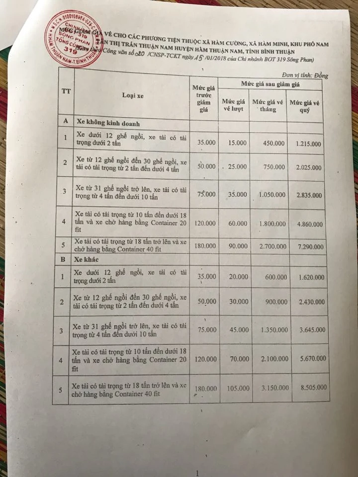 Văn bản cho biết đơn vị này sẽ giảm giá vé cho các phương tiện quanh khu vực trạm BOT Sông Phan trên QL1 gồm các xã Hàm Cường, Hàm Minh và khu phố Nam Tân, thị trấn Thuận Nam, huyện Hàm Thuận Nam từ lúc 0 giờ ngày 16-1.