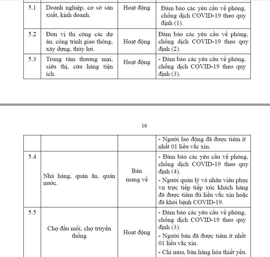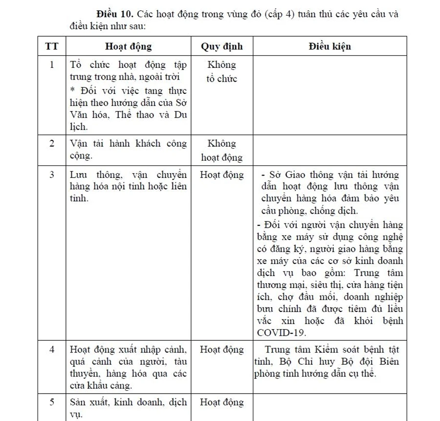 Người dân không được ra/vào vùng đỏ, trừ các trường hợp: Đưa bệnh nhân đi cấp cứu, khám chữa bệnh; cứu hỏa, thiên tai, phòng chống dịch; tang lễ. Xe đưa rước công nhân được đi qua nhưng không được phép dừng, đỗ. Các cơ sở sản xuất, công trường, ngân hàng, kho bạc, các cơ sở kinh doanh dịch vụ trực tiếp liên quan đến hoạt động ngân hàng và bổ trợ doanh nghiệp (như: Công chứng, luật sư, đăng kiểm, đăng ký giao dịch bảo đảm,...), bưu chính, viễn thông, dịch vụ hỗ trợ vận chuyển, xuất, nhập khẩu hàng hóa, cung cấp các hàng hóa thiết yếu, nguyên vật liệu phục vụ sản xuất, vận chuyển hàng nông sản, thủy sản... Những hoạt động trên phải có phương án đảm bảo phòng, chống dịch do cơ quan có thẩm quyền phê duyệt. Có giấy xác nhận của cơ quan, đơn vị cung cấp hàng hóa, có chứng nhận tiêm đủ liều vaccine phòng COVID-19 hoặc có giấy chứng nhận đã điều trị khỏi bệnh COVID-19 không quá 6 tháng hoặc có kết quả xét nghiệm SAR-CoV-2 âm tính trong vòng 72 giờ.