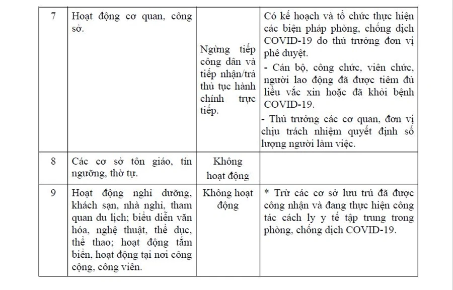 Điều 10 Quyết định số 2780/QĐ-UBND ngày 18-10 của UBND tỉnh về Quy định tạm thời các biện pháp hành chính “Thích ứng an toàn, linh hoạt, kiểm soát hiệu quả dịch COVID-19” theo từng cấp độ dịch áp dụng trên địa bàn tỉnh Bình Thuận.” (xem bảng phía dưới)