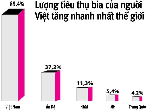 Theo nghiên cứu của tạp chí y khoa Lancet (Anh), trong giai đoạn 1990-2017, Việt Nam là quốc gia có tốc độ tiêu thụ đồ uống có cồn lớn nhất thế giới (89,4%), tiếp đó là Ấn Độ, Nhật Bản, Mỹ, Trung Quốc...
