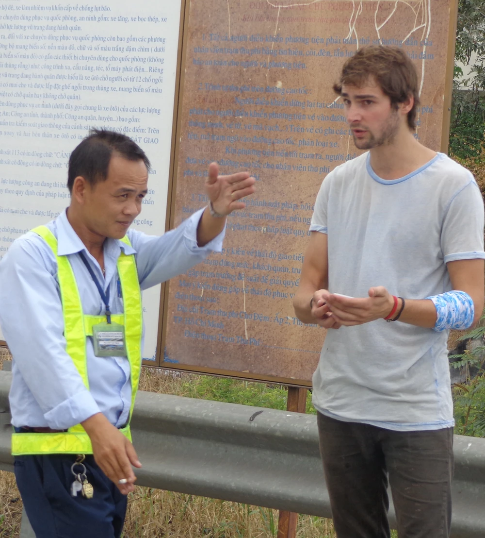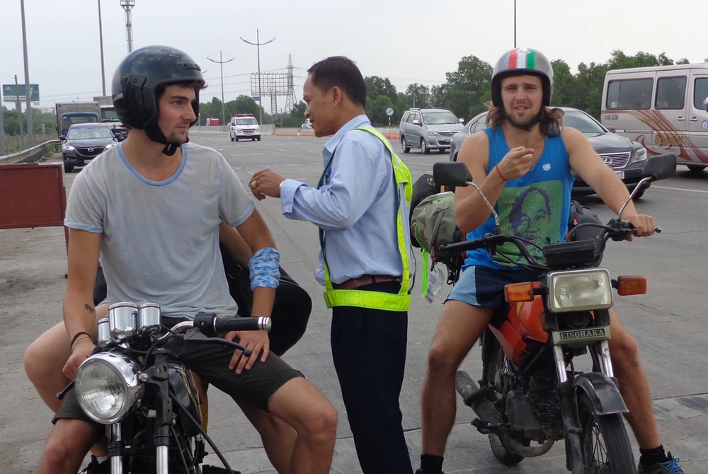 Motor không được đi vào đường cao tốc. Trong ảnh: Nhân viên tại đầu trạm thu phí đường cao tốc TP.HCM - Trung Lương, nơi theo quy định phải có trạm cấp cứu, đang hướng dẫn người đi xe máy không được đi vào đường cao tốc... Ảnh: L.Đức