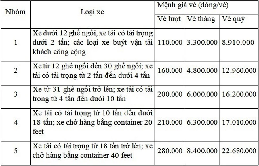 Theo đó, mức phí sẽ tăng thêm 30.000-70.000 đồng/lượt/nhóm phương tiện so với mức phí hiện nay. Cụ thể, mức phí đối với xe ô tô loại 1 tăng thêm 40.000 đồng/xe/lượt (tăng 57%); xe loại 2 tăng thêm 70.000 đồng/xe/lượt (tăng hơn 77%); xe loại 3 tăng thêm 60.000 đồng/xe/lượt (tăng hơn 42%); xe loại 4 và loại 5 cùng tăng hơn 16%, lần lượt tăng thêm 30.000 đồng/xe/lượt và 40.000 đồng/xe/lượt.