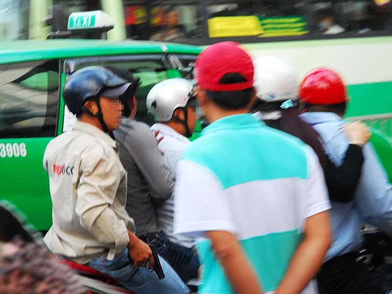 Cảnh sát hình sự dùng súng khống chế một tên cướp trên đường Ba Tháng Hai, TP.HCM. Ảnh: HTD