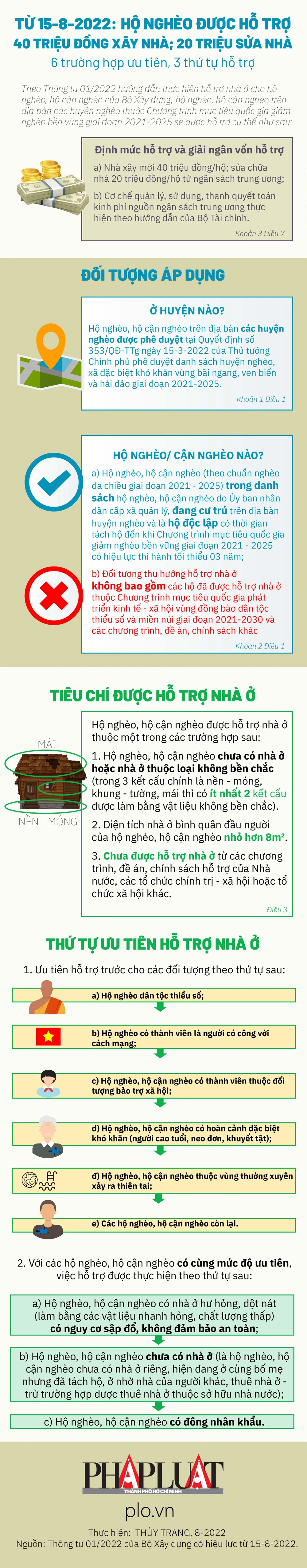 (PLO)- Theo Thông tư 01/2022 của Bộ Xây dựng có hiệu lực từ 15-8, hộ nghèo, hộ cận nghèo ở các huyện nghèo thuộc Chương trình mục tiêu quốc gia giảm nghèo bền vững giai đoạn 2021-2025 sẽ được hỗ trợ 40 triệu đồng từ ngân sách trung ương để xây nhà mới; 20 triệu đồng để sửa nhà.