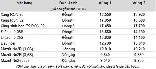 Giá xăng sinh học E5 cũng tăng 612 đồng/lít với quy định giá bán cho các doanh nghiệp không quá 17,455 đồng/lít. Dầu diesel 0.05S tăng 576 đồng/lít, mức giá bán ra thị trường không quá 13,886 đồng/lít; dầu hỏa tăng 513 đồng/lít, dầu mazut 180 CST 3.5 S cũng tăng 297 đồng/lít.