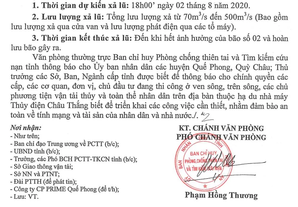 Để đảm bảo công tác vận hành xả lũ hồ chứa thủy điện Châu Thắng được an toàn theo đúng quy trình đã được Bộ Công thương phê duyệt, Công ty CP Thủy điện Prime Quế Phong đã có thông báo số 18 ngày 2-8 về kế hoạch vận hành xả lũ hồ chứa:
