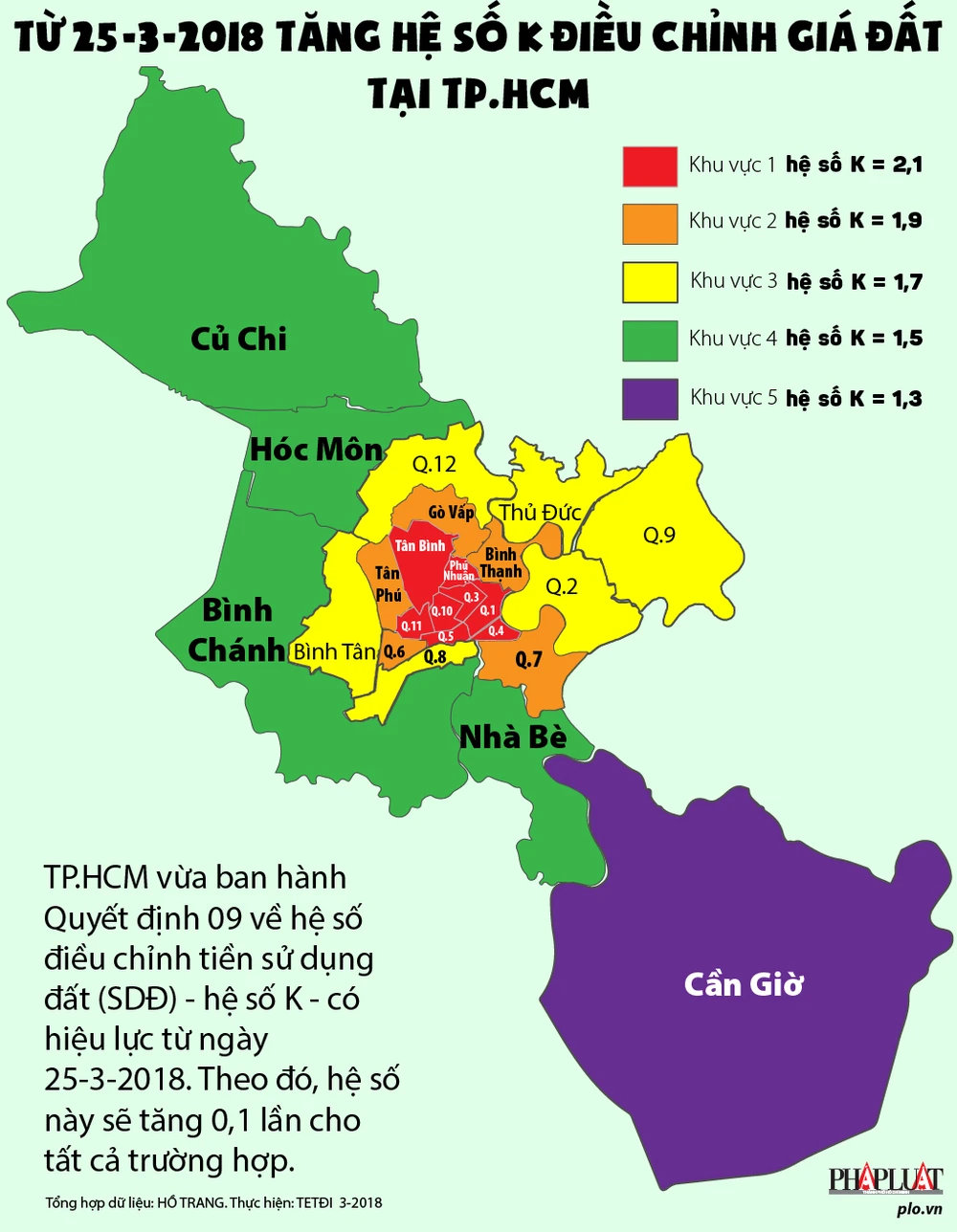 (PLO)- Từ 25-3-2018, Quyết định 09 về hệ số điều chỉnh tiền sử dụng đất - hệ số K - TP.HCM vừa ban hành chính thức có hiệu lực. Theo đó, hệ số này sẽ tăng 0,1 lần cho tất cả trường hợp.