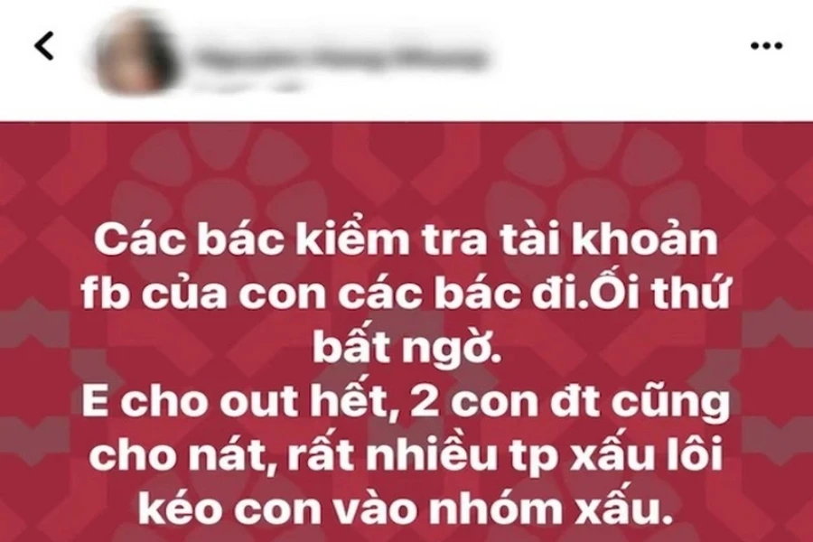 Theo đó, vợ của Xuân Bắc viết: "Các bác kiểm tra tài khoản Facebook của các con các bác đi. Ối thứ bất ngờ. Em cho out hết, hai con điện thoại cũng cho nát. Rất nhiều thành phần xấu lôi kéo con vào nhóm xấu".
