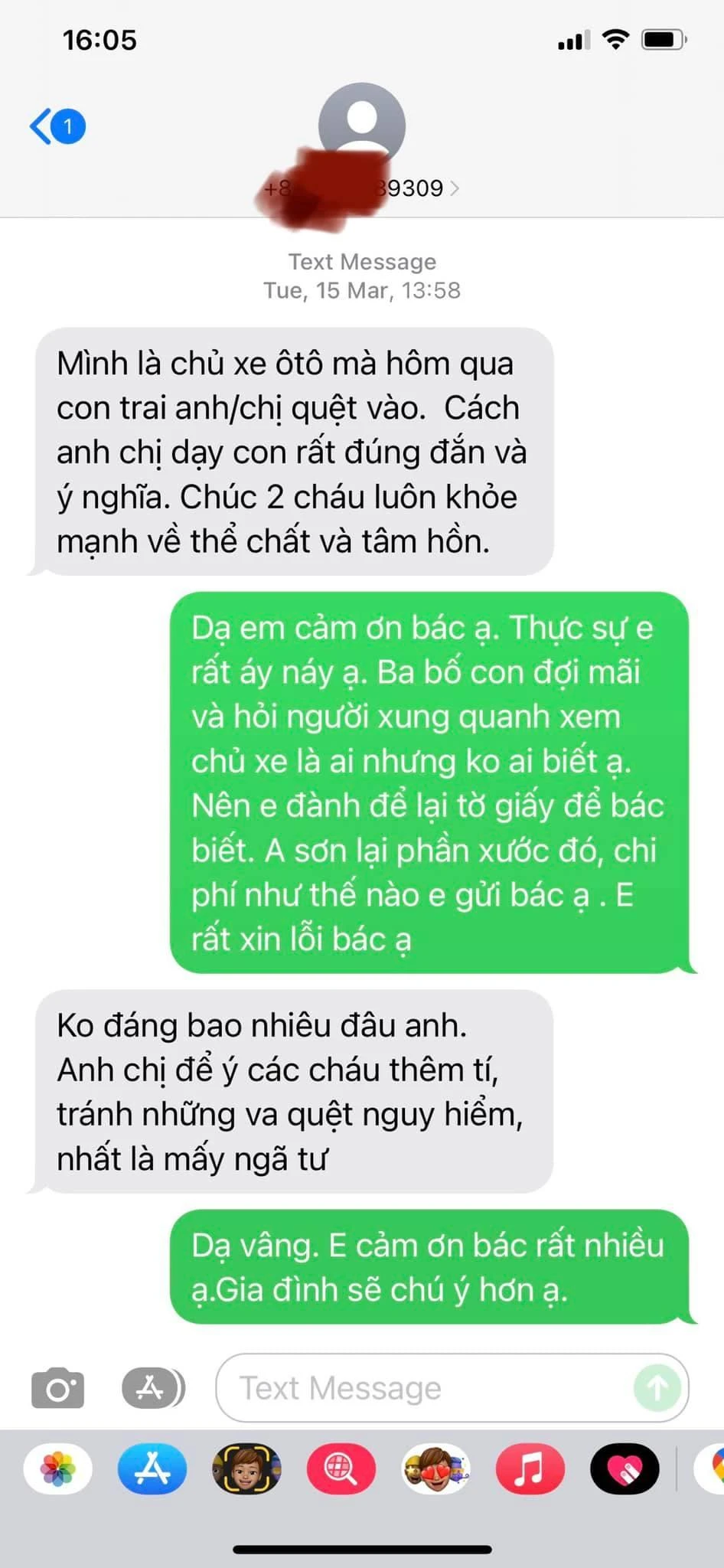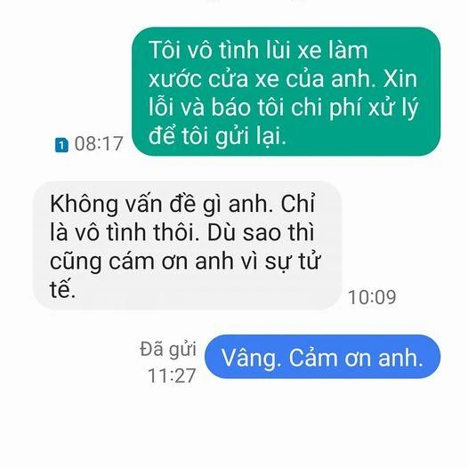 Chị Trương Phương Linh cũng chia sẻ câu chuyện của mình: “Có một hôm nhà tôi đưa hai cháu nhỏ xuống đạp xe đạp (đường trong khu cư dân), một bạn đã bất cẩn làm xước đuôi xe của một chiếc ô tô đậu bên lề đường. Nhìn quanh xe không thấy bác tài để lại số điện thoại nên có mượn giấy bút ở quán cafe gần đó nhắn vài lời kèm số điện thoại để lại trên xe. Hôm sau thì nhận được tin nhắn dễ thương của chủ xe”.