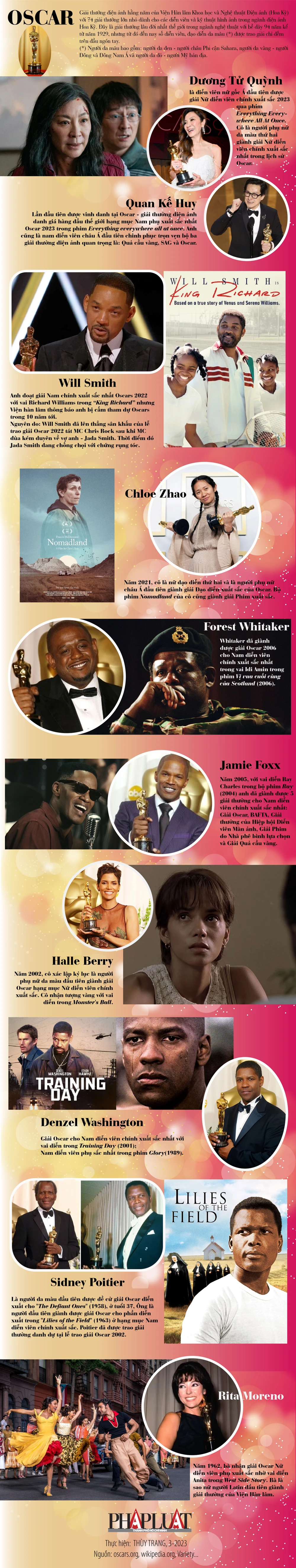 (PLO)- Chiến thắng giải điện ảnh Oscar 2023 danh giá của hai diễn viên gốc Á Quan Kế Huy, Dương Tử Quỳnh mới đây cho thấy Viện Hàn lâm Hoa Kỳ ngày càng có cái nhìn cởi mở, khách quan hơn. Cùng PLO.VN điểm lại những nghệ sĩ da màu nào từng được giải Oscar từ xưa đến nay.