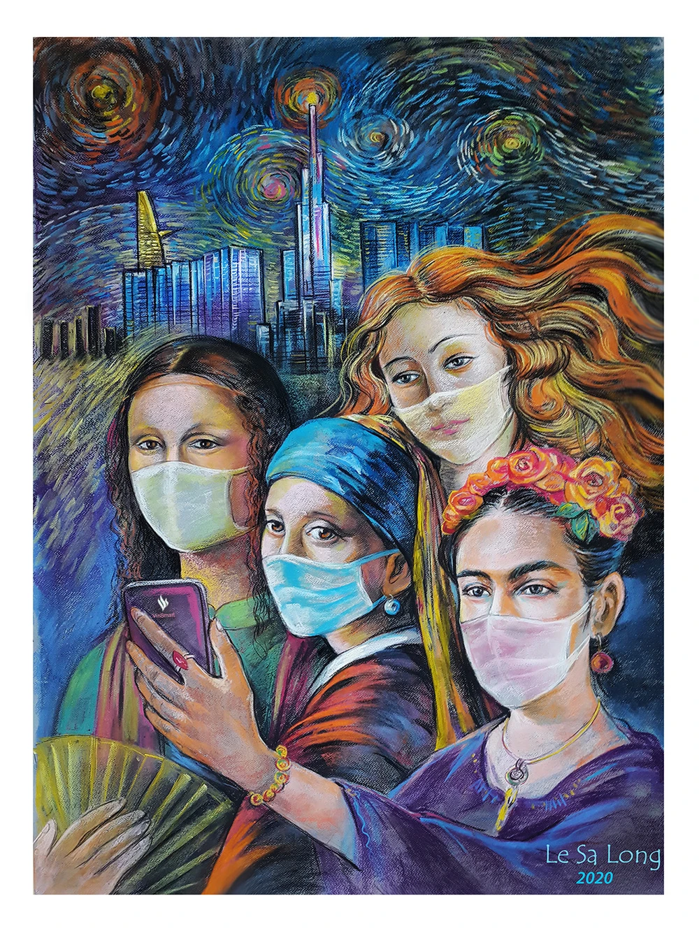 Bức tranh "Tứ đại mỹ nhân thăm Sài Gòn" gồm Mona Lisa của danh họa Leonardo da Vinci; Thần Vệ nữ sinh ra từ biển của danh họa Sandro Botticelli; Thiếu nữ đeo hoa tai ngọc trai của họa sĩ Johannes Vermeer và nhân vật thật cầm chiếc Vsmart là nữ họa sĩ người Mehico - Frida Kahlo. Trong tranh: Các mỹ nhân khi đến "du lịch" tại TP.HCM cũng phải mang khẩu trang. Bức tranh hưởng ứng lệnh bắt buộc người dân mang khẩu trang khi ra đường của lãnh đạo TP.HCM vào đầu tháng 8.