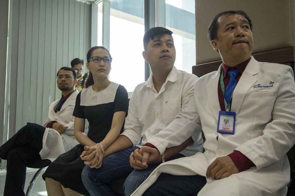 Ba mẹ song Nhi nắm tay y bác sĩ cùng theo dõi báo cáo sức khỏe của con.
