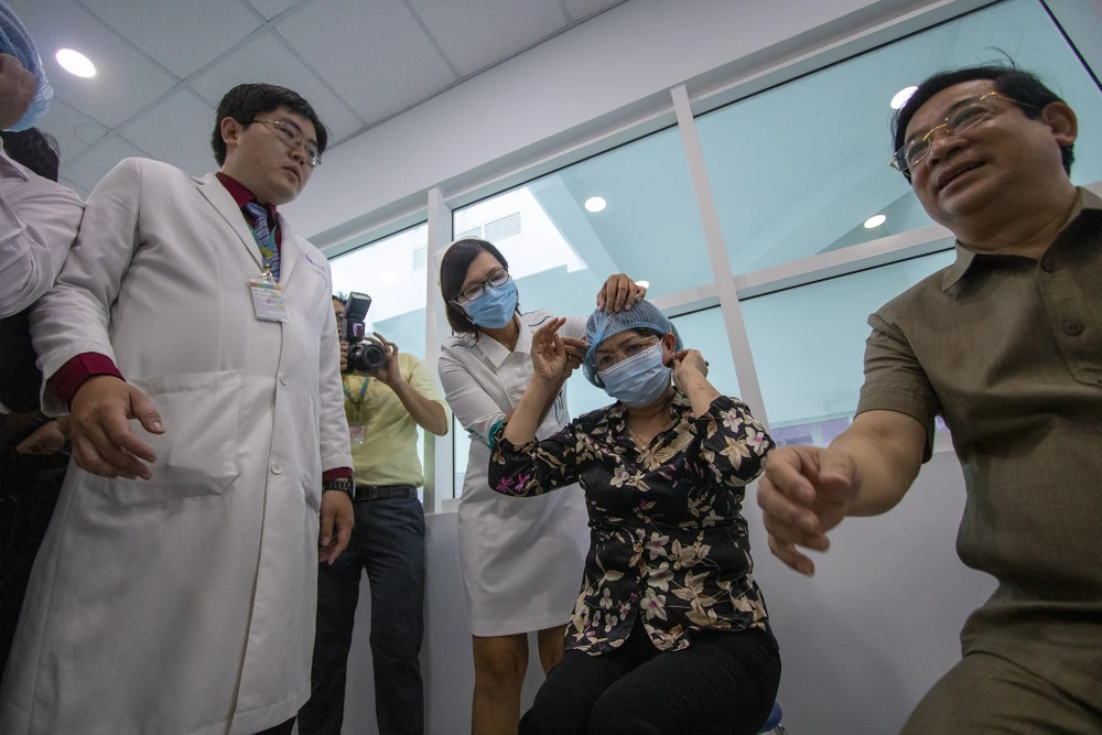 Phó Chủ tịch nước mặc đồ bảo hộ trước khi vào thăm hai bé song Nhi.