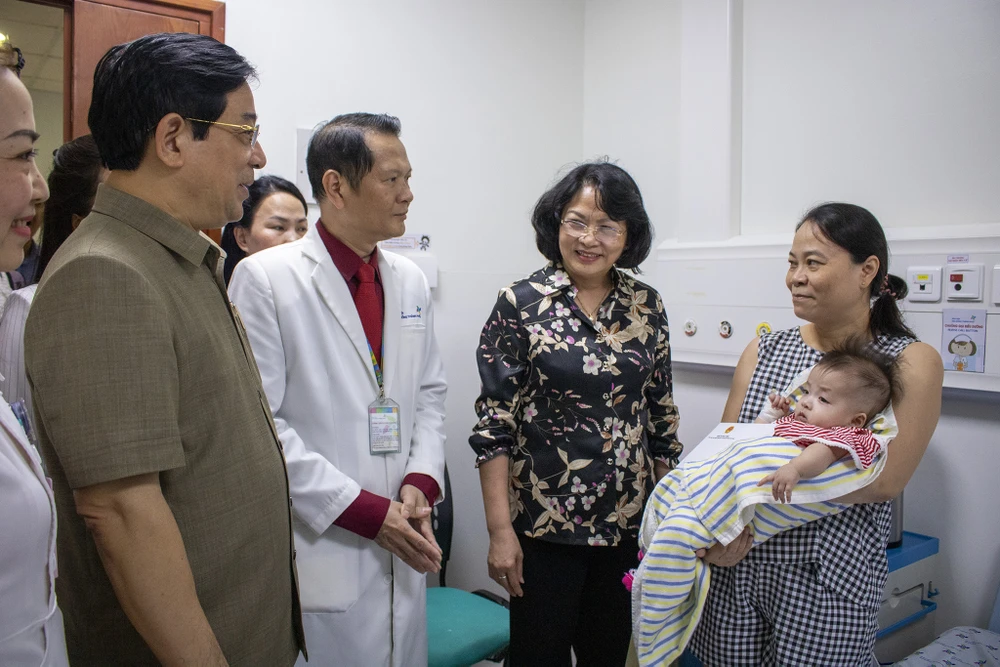Phó chủ tịch nước Đặng Thị Ngọc Thịnh thăm hỏi hai bé. Ảnh: BVCC