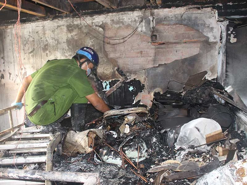 Công an khám nghiệm hiện trường vụ cháy ở quận 4 khiến bé trai 10 tuổi tử vong. Ảnh: QUÂN LÊ