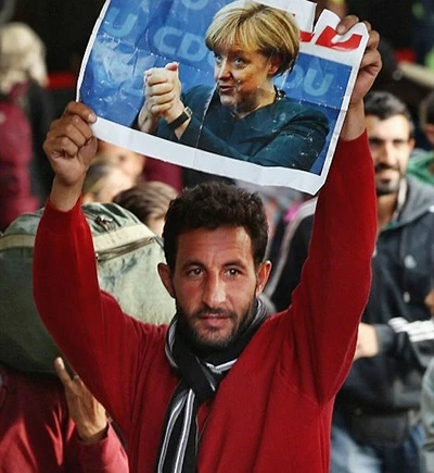 Ngày 6-9, người nhập cư từ Hungary đến Munich (Đức) đã giơ cao ảnh thủ tướng Đức như lời cảm ơn nước Đức đã cưu mang họ. Ảnh: GETTY IMAGES