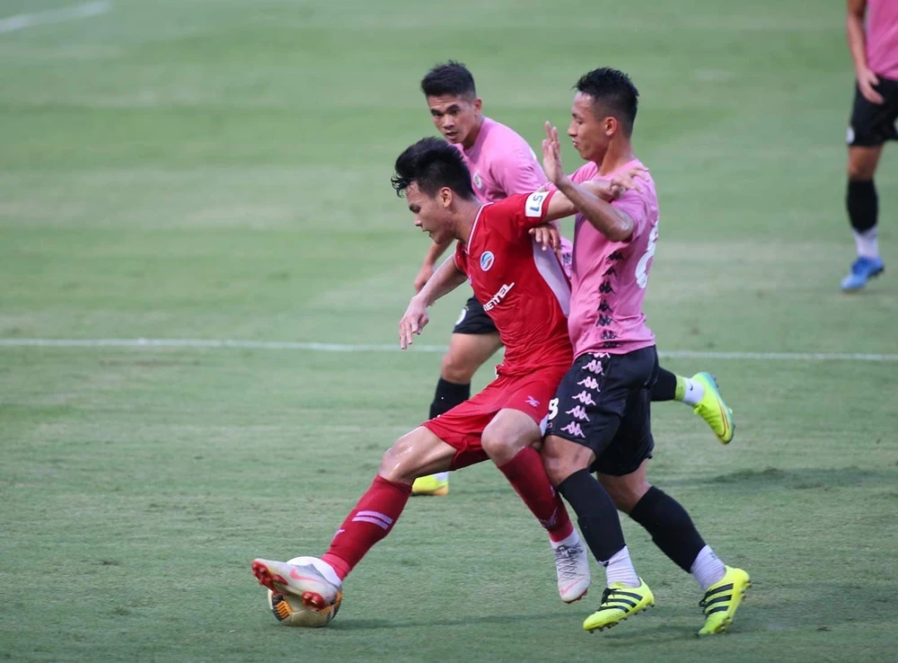 Tuyển thủ U-22, nhà vô địch SEA Games 30 Hoàng Đức (phải) không thể có bàn thắng nào trước Hà Nội. Ảnh: N.D