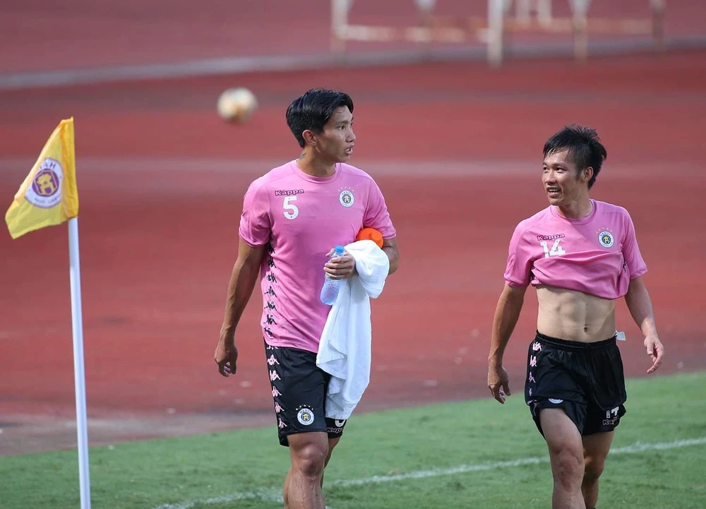 Hà Nội FC đang khủng hoảng hàng phòng ngự, từ Heerenveen trở về, Hậu (5) được HLV Chu Đình Nghiêm bố trí đá trugn vệ lệch trái. Vị trí này của Hậu được xem như thử nghiệm để Hậu tạm thay thế Đình Trọng đang gặp chấn thương. Ảnh: Ngọc Dung