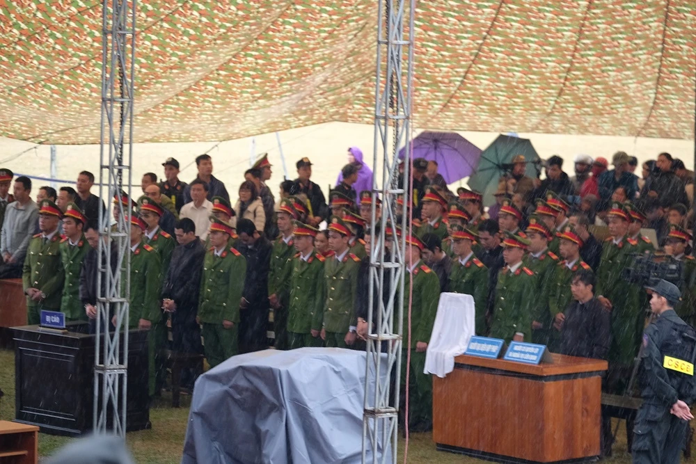 Tòa tuyên án đối với các bị cáo, trời đang mưa to. Ảnh: DTĐT