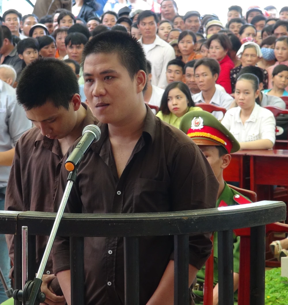 Bị cáo Chuyên (cúi mặt) và Lập tại phiên xử.