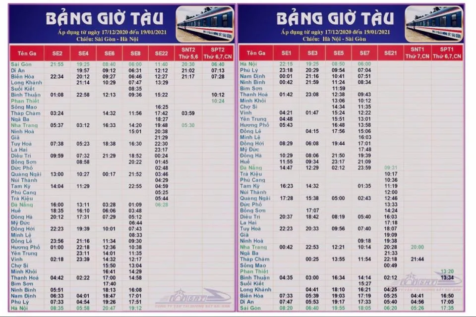 Công ty Cổ phần Vận tải đường sắt Sài Gòn cho biết, do ảnh hưởng của việc thi công cải tạo, nâng cấp tuyến đường sắt, Tổng công ty Đường sắt Việt Nam tạm thời điều chỉnh giờ tàu khách đi đến các ga trên tuyến đường sắt TP.HCM – Hà Nội từ ngày 17-12-2020 đến hết ngày 19-1-2021.