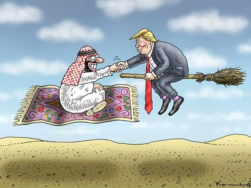 Tổng thống Trump đến Saudi Arabia ngày 21-5 và đã chỉ trích Iran hết lời. Biếm họa của Marian Kamensky ở Áo.