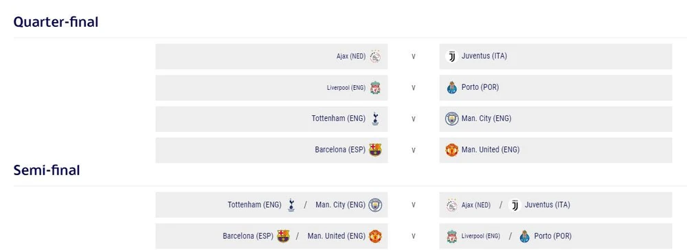 Tại bán kết, đội thắng trong cặp Tottenham - Manchester City sẽ gặp đội thắng cặp Ajax - Juventus. Trận bán kết còn lại là đội thắng cặp Barcelona - MU gặp đội thắng cặp Liverpool - Porto.